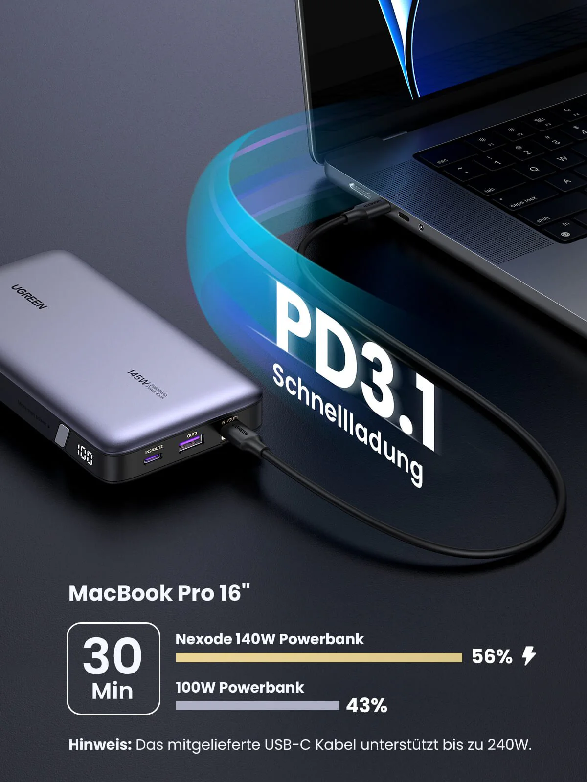 UGREEN Powerbank (20000mAh, 22.5W, integriertem USB-C-Kabel)